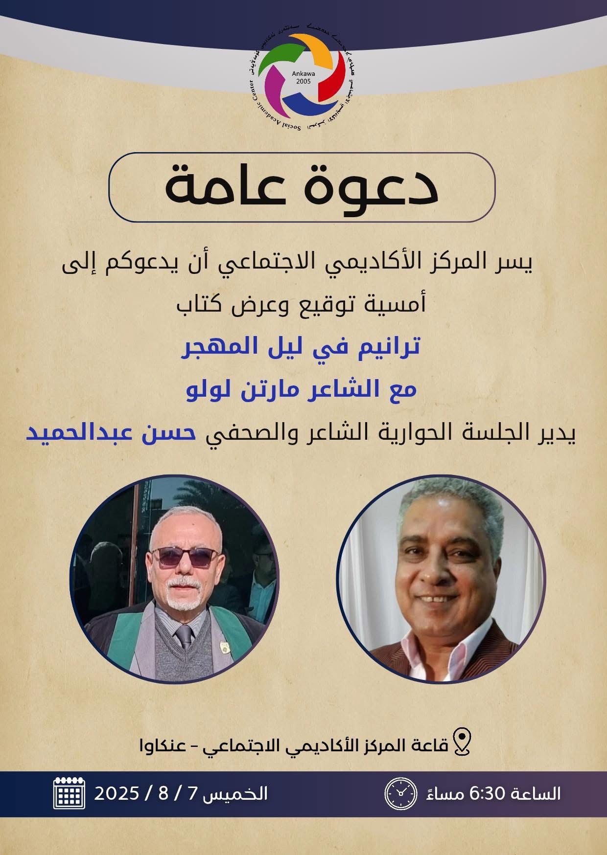 المركز الأكاديمي الاجتماعي يحتضن أمسية توقيع وعرض ديوان “ترانيم في ليل المهجر” للشاعر مارتن لولو