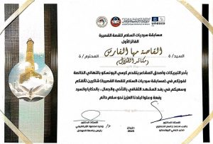 وقد تقدم كرسي اليونسكو بأحر التهاني والتبريكات للفائزة، مشيدًا بتألقها الأدبي، ومثنيًا على جهودها في إغناء المشهد الثقافي برؤية إبداعية تنبض بالجمال والسرد الهادف، ومؤكدًا أن مثل هذه المشاركات تسهم في ترسيخ قيم السلام وتعزيز الوعي الإنساني.