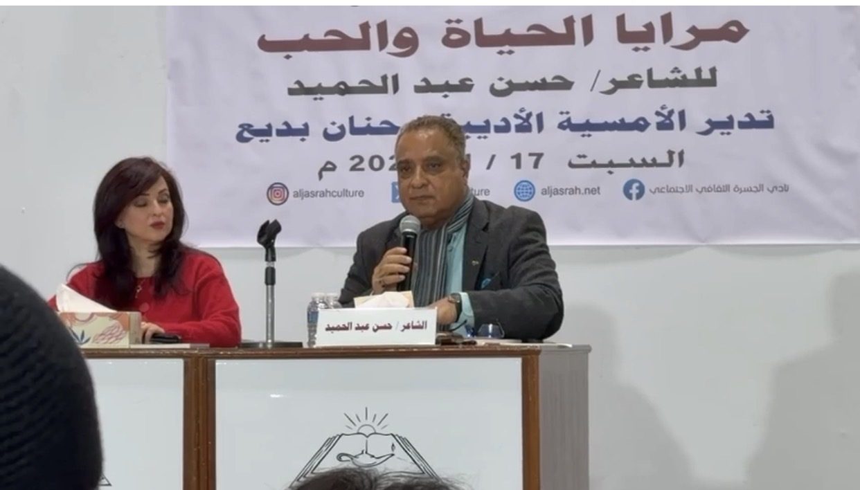 استضاف صالون الجسرة الثقافي الشاعر حسن عبد الحميد في أمسية شعرية أقيمت مساء السبت الماضي 17 يناير 2026 بمقر نادي الجسرة الثقافي في سوق واقف، وقد استهلت الأديبة حنان بديع منسقة صالون الجسرة الثقافي هذه الأمسية بالترحيب بالضيوف وجمهور المثقفين الذين حضروا الأمسية، وقدمت نبذة تعريفية عن الشاعر الذي بدأ إثر التقديم في عرض إبداعاته الشعرية.
